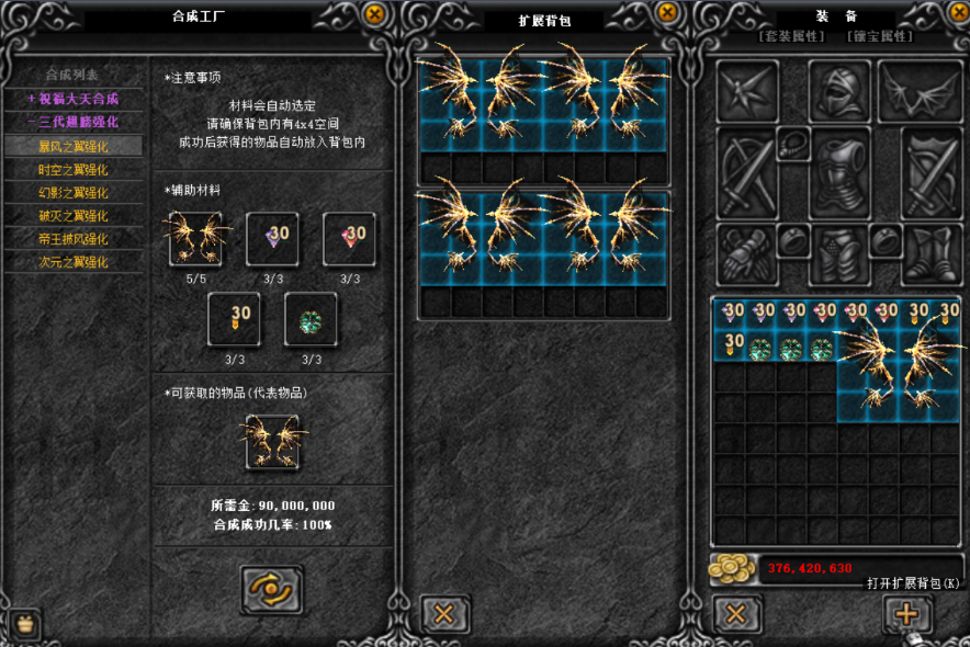 三代翅膀强化(生成5%无视,5%反弹属性):任意等级同名三代翅膀5个,祝福宝石组合(30个)3组,灵魂宝石组合(30个)3组,玛雅之石组合(30个)3组,幸运符咒3个,金币9000万,成功几率100%!